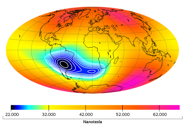 La SAA è un’area in cui la fascia di radiazione di Van Allen , situata all’interno della Terra, si avvicina insolitamente alla superficie del pianeta. Questo crea un campo magnetico indebolito su alcune parti del Sud America e dell’Oceano Atlantico meridionale. Quando i satelliti la attraversano, vengono bombardati da intense radiazioni, causando spesso corruzione dei dati, interruzioni di corrente e inspiegabili problemi tecnici.
