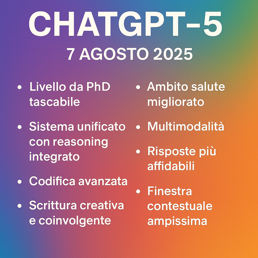 - ChatGPT-5: ragionamento multimodale (testo, immagini, grafici), integrazione con Gmail e Google Calendar, maggiore sicurezza nei contenuti, tono più bilanciato.